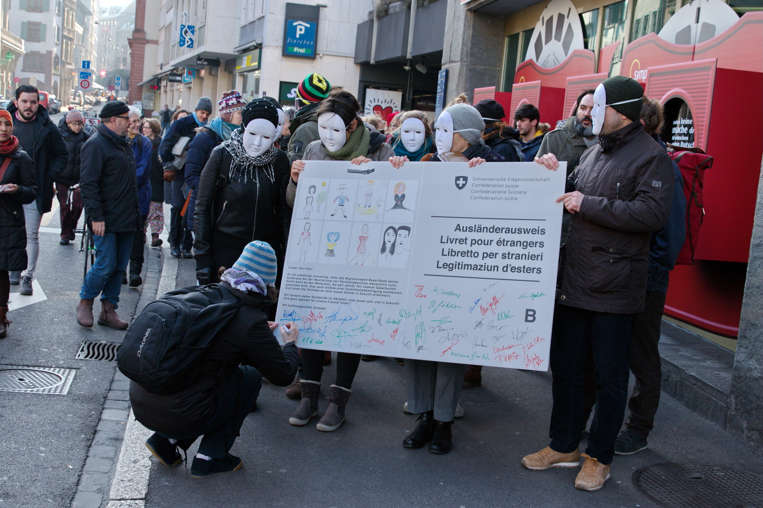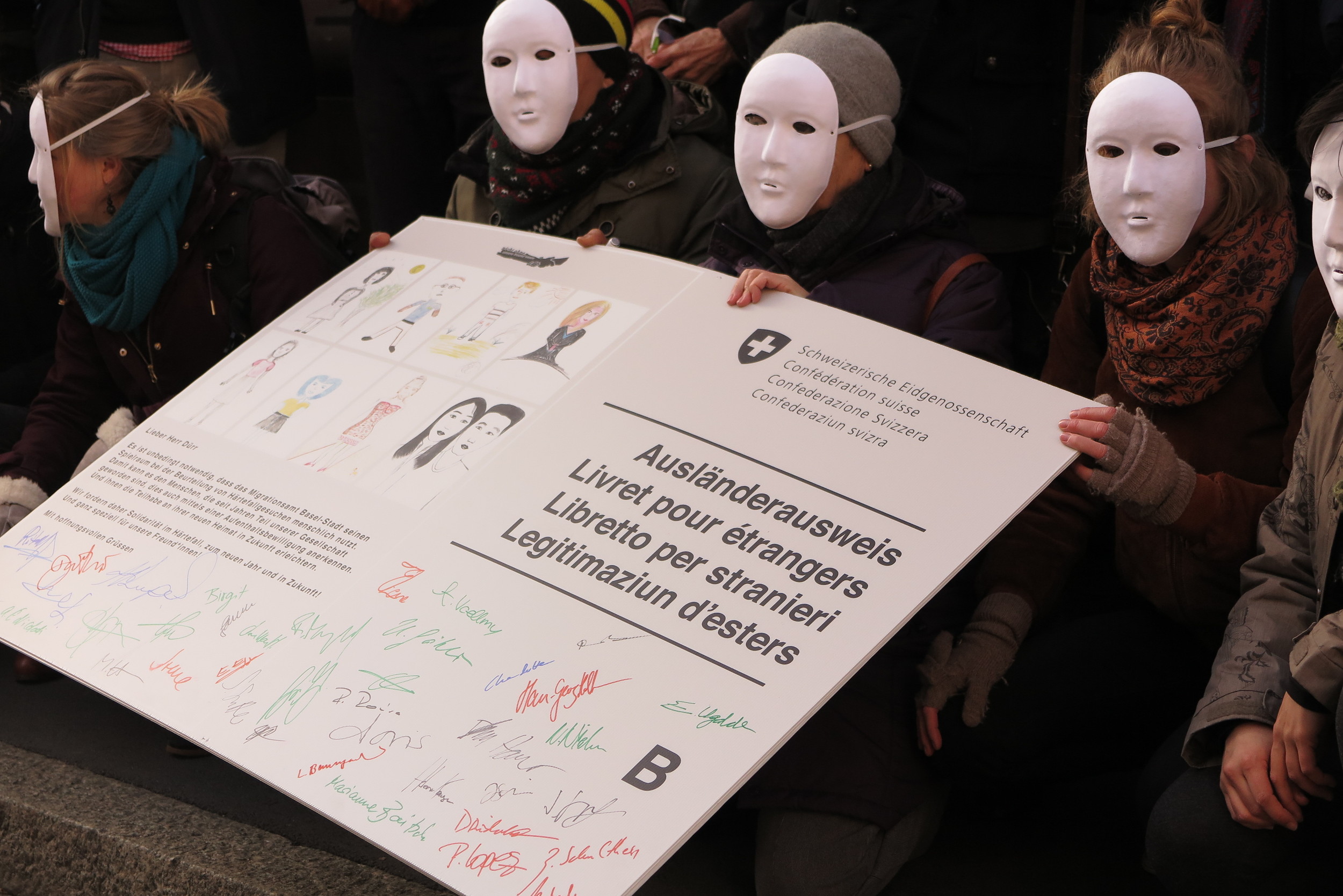 Nachdem ganz viele Leute in den vergangenen Wochen unsere Wunschkarten unterzeichnet und abgeschickt haben, sind wir nun persönlich bei ihm vorbeigegangen, um eine Riesenwunschkarte zu übergeben. Wir haben uns beim Stadthaus der Bürgergemeinde versammelt und alle gemeinsam die Karte unterzeichnet. Gut fünfzig Personen haben darauf hin neun maskierte ‚Sans-Papiers‘ zum Justiz- und Sicherheitsdepartement im Spiegelhof geleitet. Da wurden wir von Baschi Dürr empfangen, der interessiert unserer Rede zugehört hat. In dieser haben wir bekräftigt, dass wir eine Politik gegenüber Sans-Papiers fordern, die dem offenen Geist der Stadt gerecht wird. Für die Behörden bedeutet das, dass sie Härtefallgesuche von Sans-Papiers wohlwollend begutachten und insbesondere die Gesuche unserer neun Freund*innen gutheissen und nach Bern weiterleiten. Herzlichen Dank an alle, die dabei waren! Unter den Bildern findet sich noch die Rede, die wir gehalten haben.