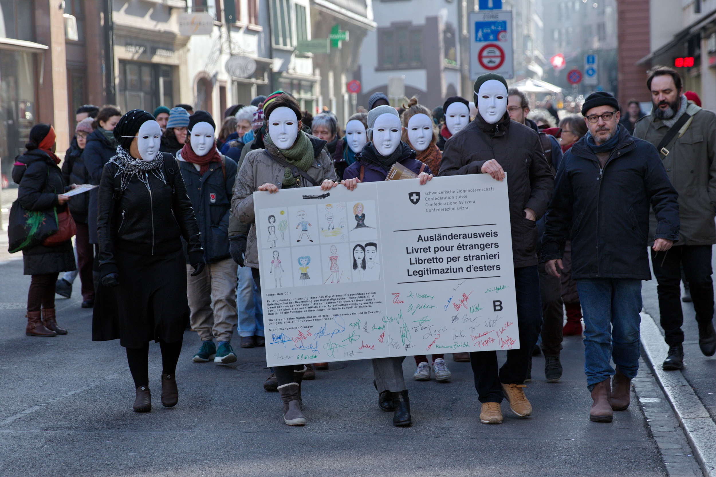 Wir stehen hier als Bewohnerinnen der Stadt Basel. Ob hier geboren oder zugezogen, sind wir alle Teil davon, dass die Stadt nicht nur aus Stein und Beton besteht, sondern lebt. Wir tragen alle dazu bei, dass Basel nach wie vor eine humanitäre, eine liberale, eine soziale Stadt ist. Aber wir sind besorgt. Wir sind nicht mehr sicher, ob auch die Politik und die Behörden den Geist der lebendigen und offenen Stadt mittragen – insbesondere im Bereich der Sans-Papiers.