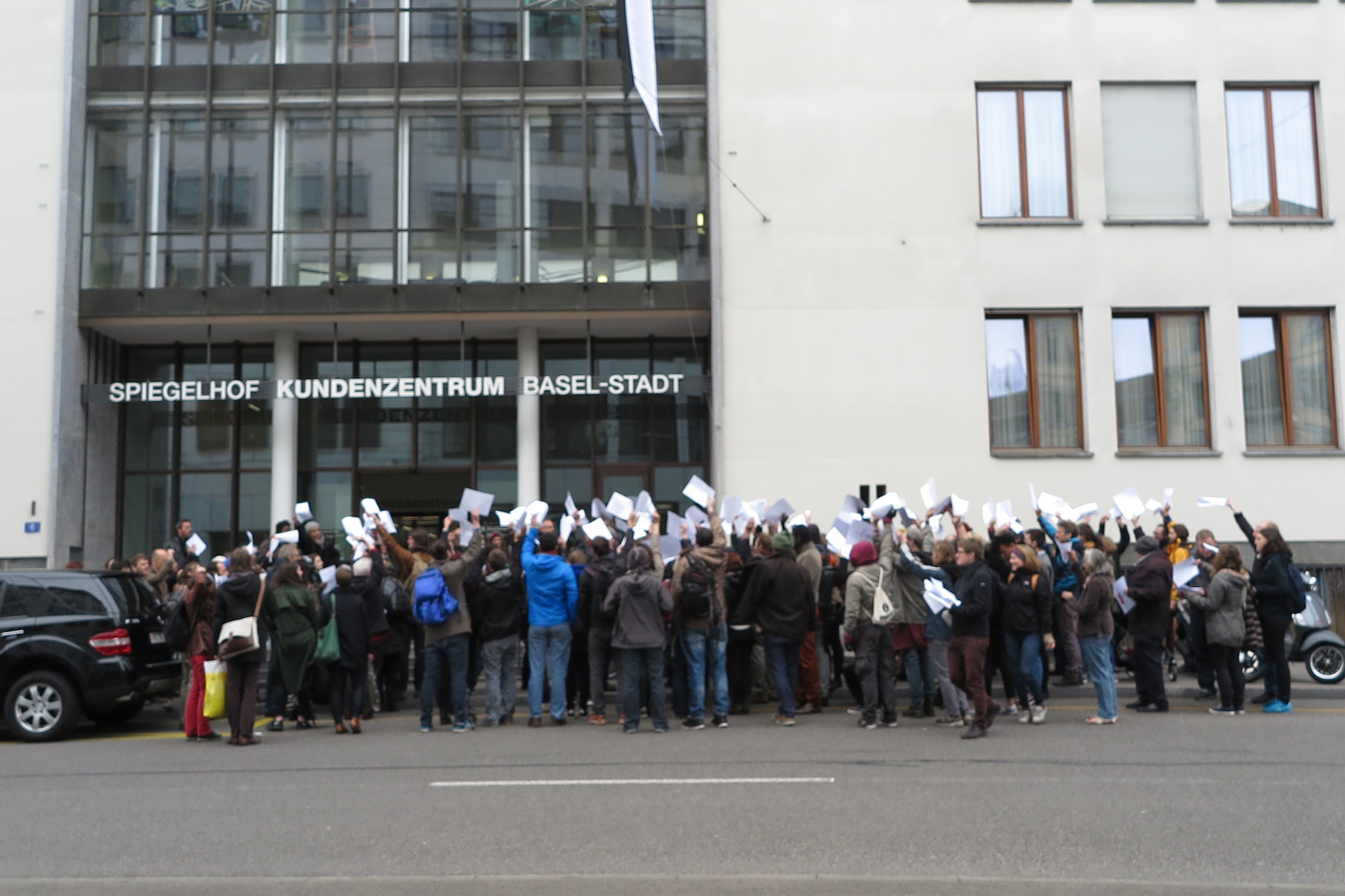 Am Donnerstag, dem 7. April haben wir die Härtefallgesuche eingereicht. Fünf der Sans-Papiers haben ihr Härtefallgesuch namentlich eingereicht. Nach Jahren und Jahrzehnten des Lebens in Basel legen sie die Masken der Anonymität ab und ersuchen um eine Bewilligung, um endlich ohne Angst in ihrer neuen Heimat leben zu können. Desirée, eine der Sans-Papiers, sagte in ihrer Rede: „Es ist ein grosser Schritt für uns, diese Gesuche einzureichen. Jahrelang haben wir uns versteckt und mussten immer Angst haben. Jetzt nehmen wir unsere Masken ab und zeigen uns. Unser grosser Wunsch ist es, dass wir ohne Masken hier leben können.“ Drei der Sans-Papiers konnten sich nicht dazu entscheiden, das grosse Risiko, das mit der Offenlegung der Identität einhergeht, einzugehen. Da aber auch sie die Kriterien dafür, ein Härtefall zu sein, erfüllen, haben sie ihre Dossiers noch einmal anonym eingereicht.