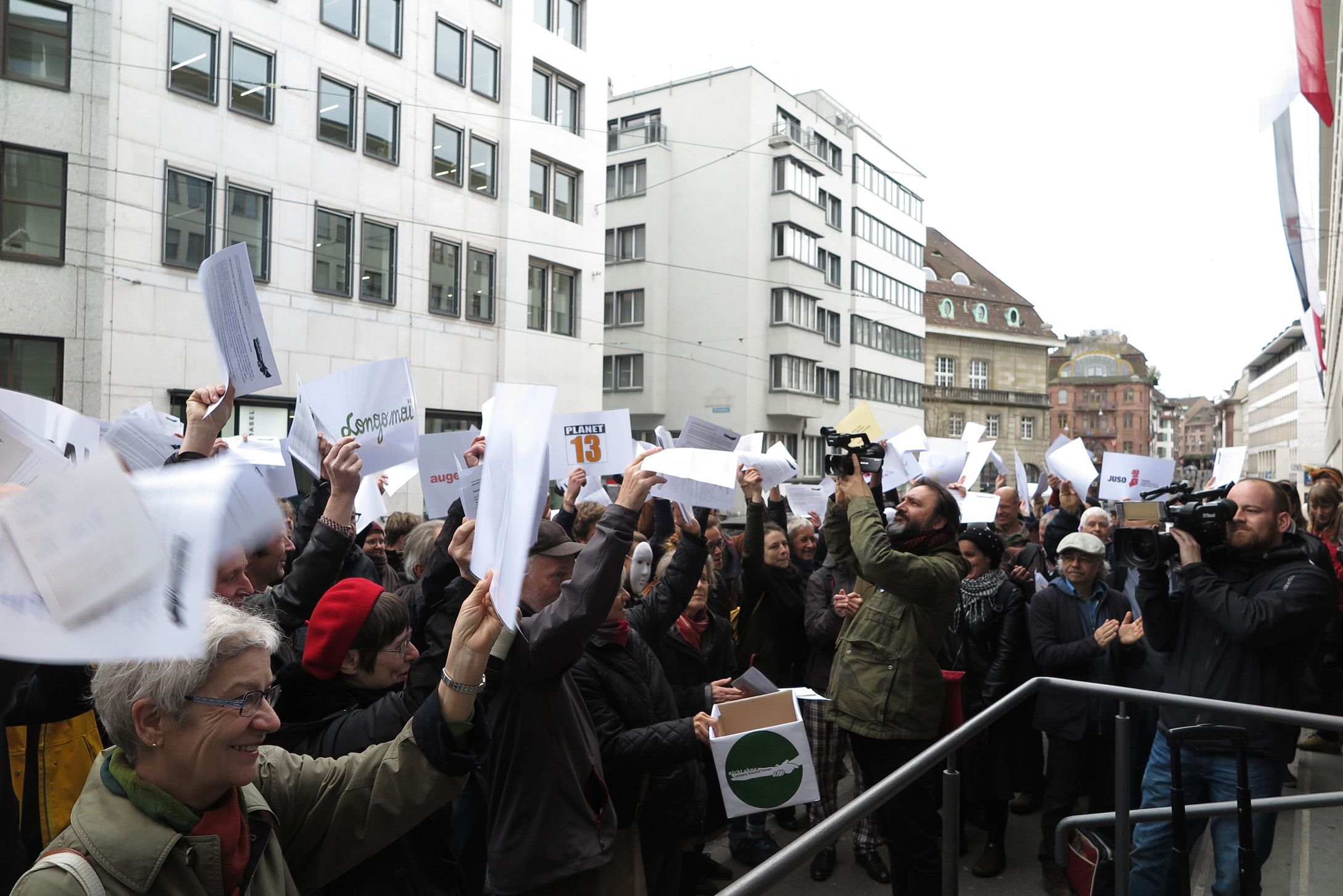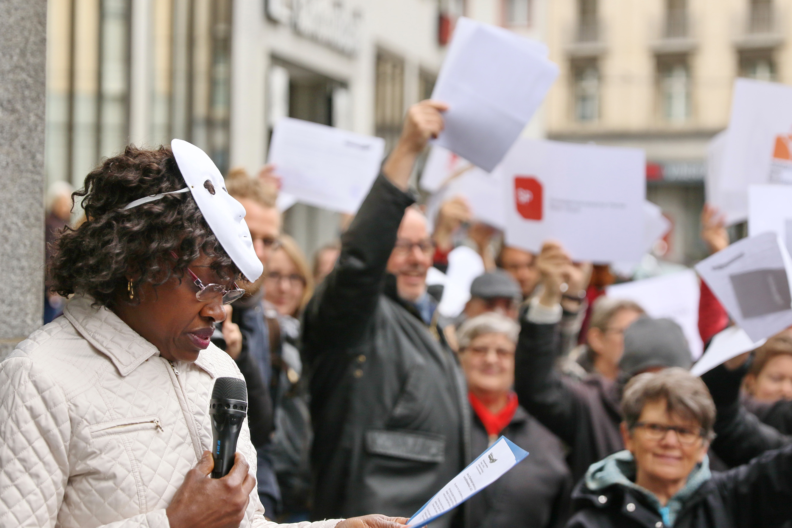 Rund 130 Personen haben die Sans-Papiers bei der Übergabe unterstützt. Auch die Sans-Papiers haben in den vergangenen Wochen und Monaten die grosse Solidarität gespürt. So sagte Desirée in ihrer Rede: „Es freut uns sehr, dass sich so viele Menschen solidarisch zeigen und uns den Rücken stärken.“ Nach der Rede haben acht Personen mit Masken dem Leiter des Migrationsamts, Herrn Michel Girard, die Gesuche und gleichzeitig auch die Masken übergeben. Danach wurden die während der Übergabe von allen Beteiligten geschwenkten Unterschriftenbögen und Logos in einer Kiste gesammelt und Herrn Frey, dem Generalsekretär des Justiz- und Sicherheitsdepartements übergeben.